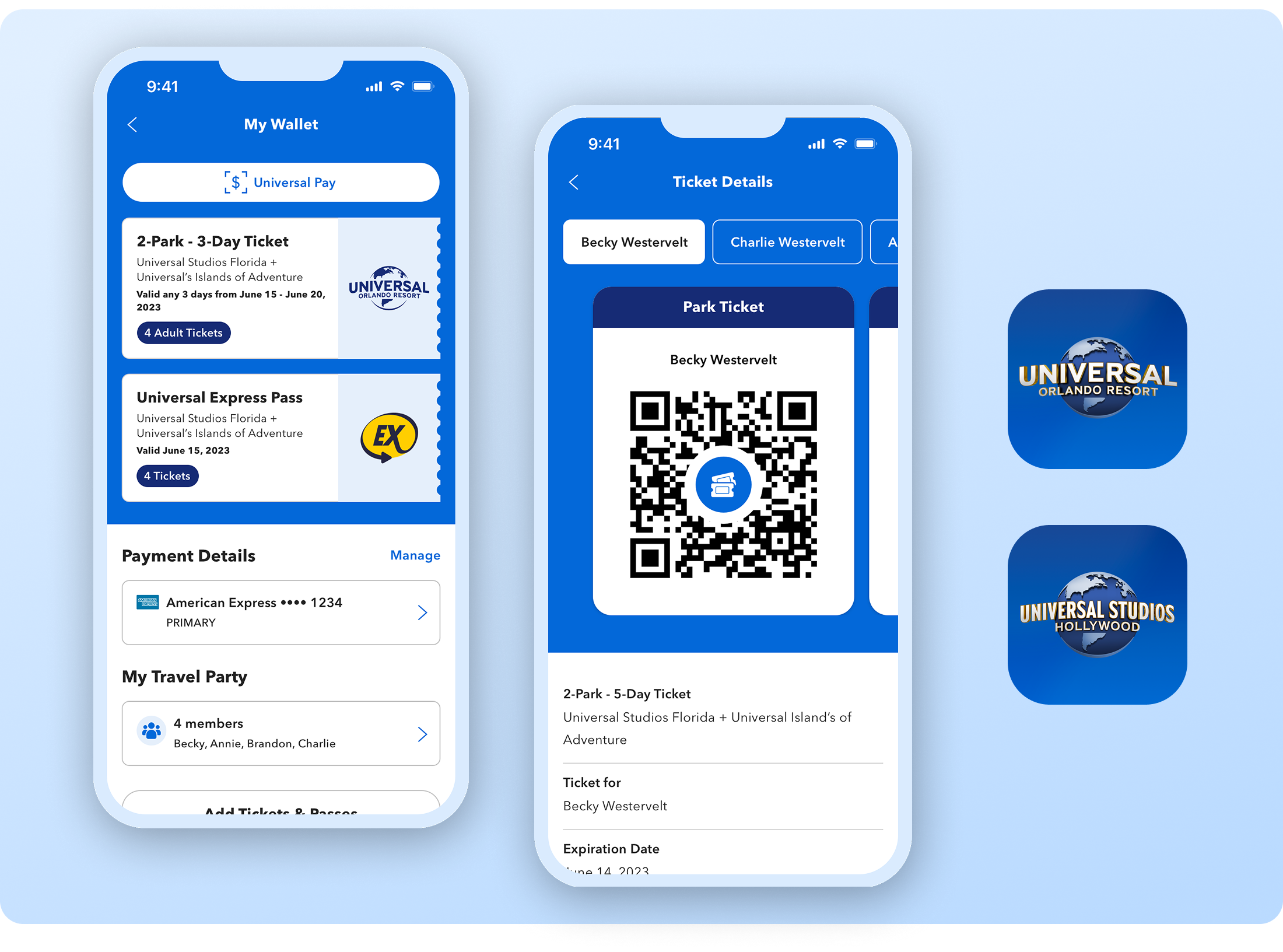 View ProjectApp wallet redesign for Universal Orlando and Hollywood. Guests can use wallet to manage park tickets and payment methods for touchless pay.